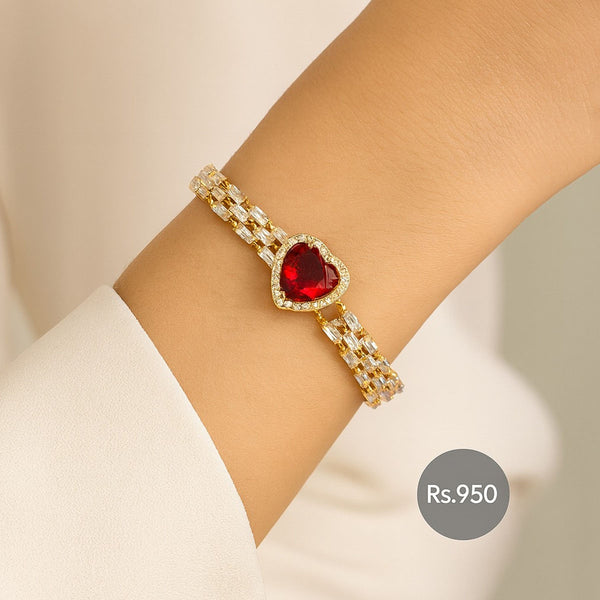 A vivid *red heart stone* framed with micro-pavé sits on a double-row *baguette CZ* tennis line. Lightweight, stackable, and gift-ready—premium shine under *Rs. 1,000*.