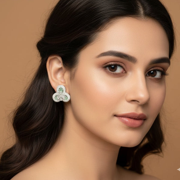 Graceful American Diamond floral stud earrings featuring a refined clustered design with sparkling stones. A versatile pair perfect for everyday elegance, festive looks, and formal occasions.
