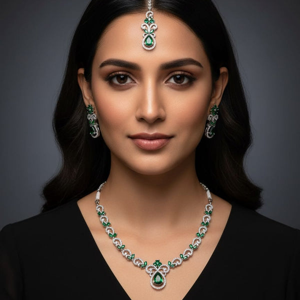 Elegant silver-tone necklace set featuring emerald-green crystal stones with matching earrings and maang tikka. A refined jewelry set perfect for parties, festive wear & formal occasions.