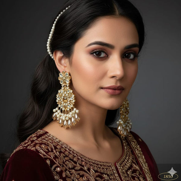 Elegant designer bridal earrings adorned with kundan stones and pearl drops. Perfect for weddings, receptions & festive wear.