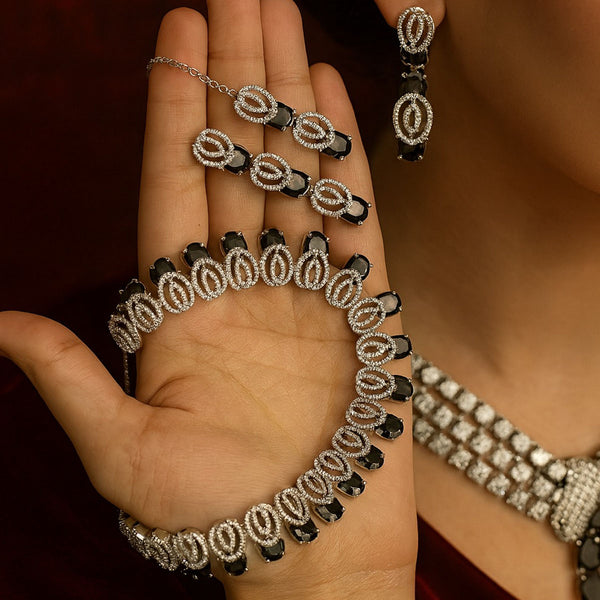 Elegant black stone necklace set with teardrop design and matching earrings. Perfect for formal evenings & festive looks.
