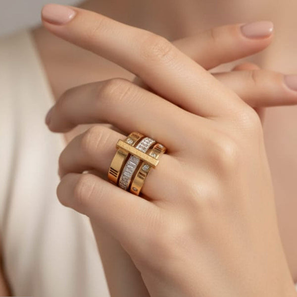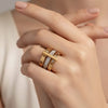 Architectural. Bold. Modern Glam.✨Our Designer Inspired Intersecting Bar & Crystal Cocktail Ring is a modern statement piece. It features bold, intersecting bands of polished gold-tone metal paired with a bar intricately paved with brilliant CZ crystals. This sculptural ring offers a unique, high-fashion look perfect for cocktail events and adding instant chic to your everyday style.