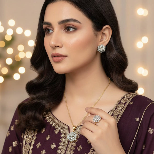 This Original Gold Plated Pendant Set is designed for women who appreciate refined simplicity. Featuring real stones set in a delicate floral pattern, this pendant adds a graceful glow without being overpowering. Paired with matching stud earrings, it’s a versatile set that complements both eastern and western outfits effortlessly.