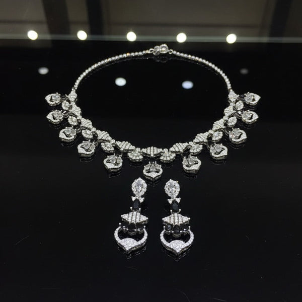 Command the spotlight with the Midnight Gala Set. This high-fashion rhodium-plated ensemble features an intricate scalloped crystal necklace and matching chandelier earrings, punctuated by deep midnight black gemstone drops for a sophisticated, red-carpet look.