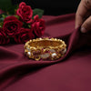 A masterpiece of traditional craftsmanship, this broad gold-finish kada features high-relief floral carvings, vibrant ruby-red clusters, and luminous pearls. A regal statement piece for the modern bride.