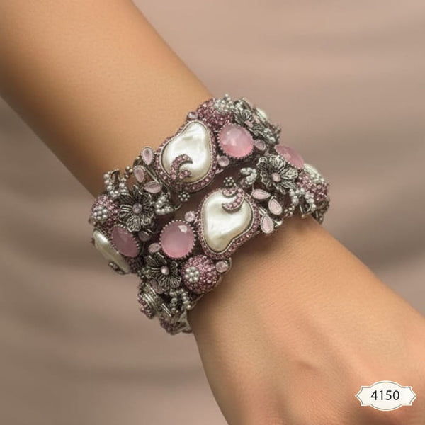Type: Bangles / Kadas (Pair) Material: Alloy (Oxidized/Dark Silver Tone Finish), Imitation Stone/Crystal, Imitation Pearl Style: Traditional / Antique / Oxidized / Pearl / Wide Statement / Vintage Gender: Women Occasion: Festive Celebration, Traditional Events, Formal Dinner, Vintage Theme