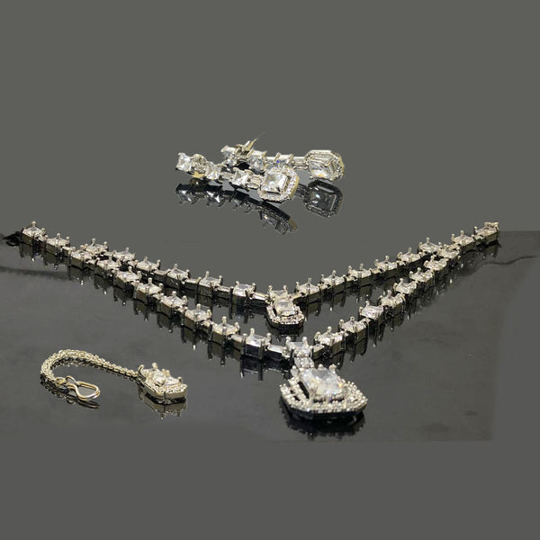 This elegant V-shaped necklace set is adorned with radiant American diamonds in a geometric pattern, featuring a brilliant-cut center drop. Comes with matching earrings and tikka—perfect for luxe soirées and bridal sparkle.